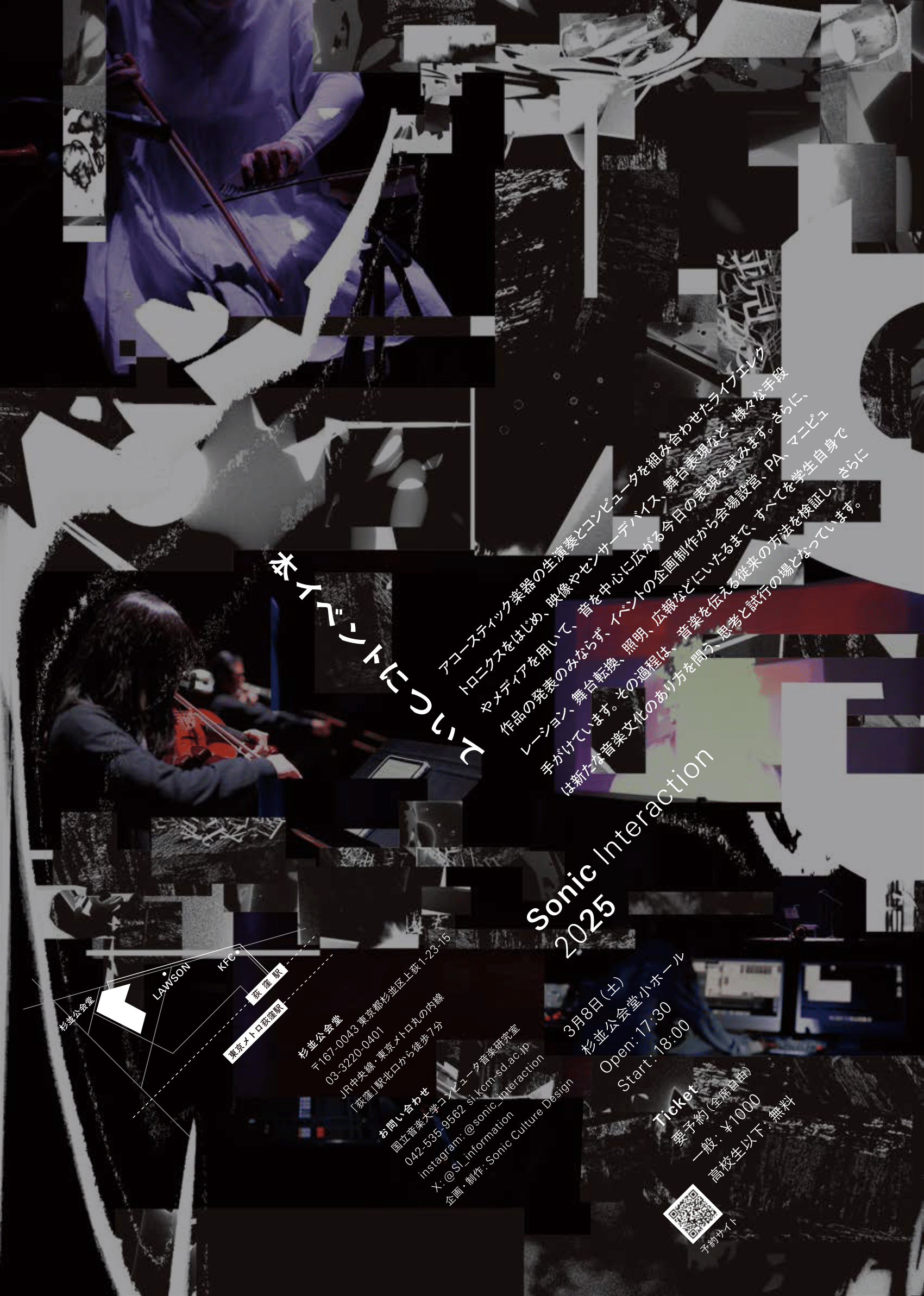 学科有志で行っているコンサート「SonicInteraction」のチラシ&パンフレットデザインを担当した。過去自分が制作した映像作品の断片を素材として利用し、コラージュ的に合成することでバックのビジュアルを制作した。
